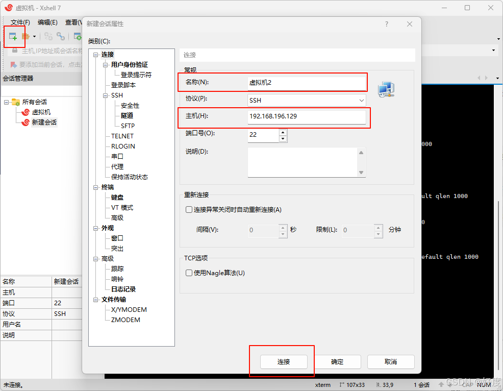 打开刚刚下载的Xshell软件,创建连接, 输入名称和ip地址, 这个ip地址就是上面截图这个地址,然后点击连接