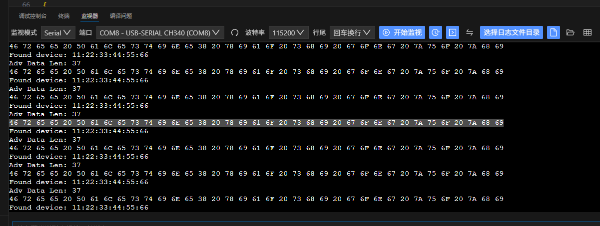 更改例程的sle_sample_seek_result_info_cbk,搜索到星闪广播设备后从串口打印结果