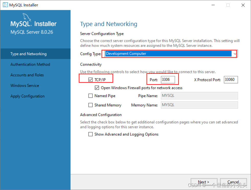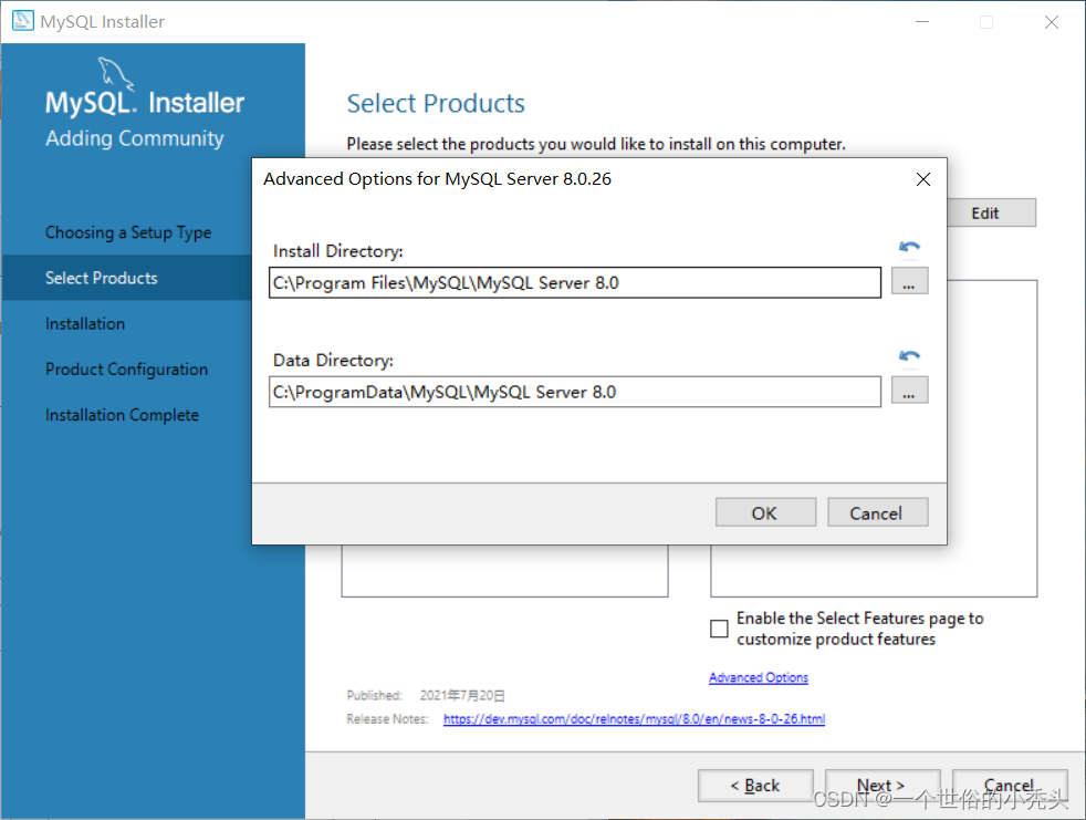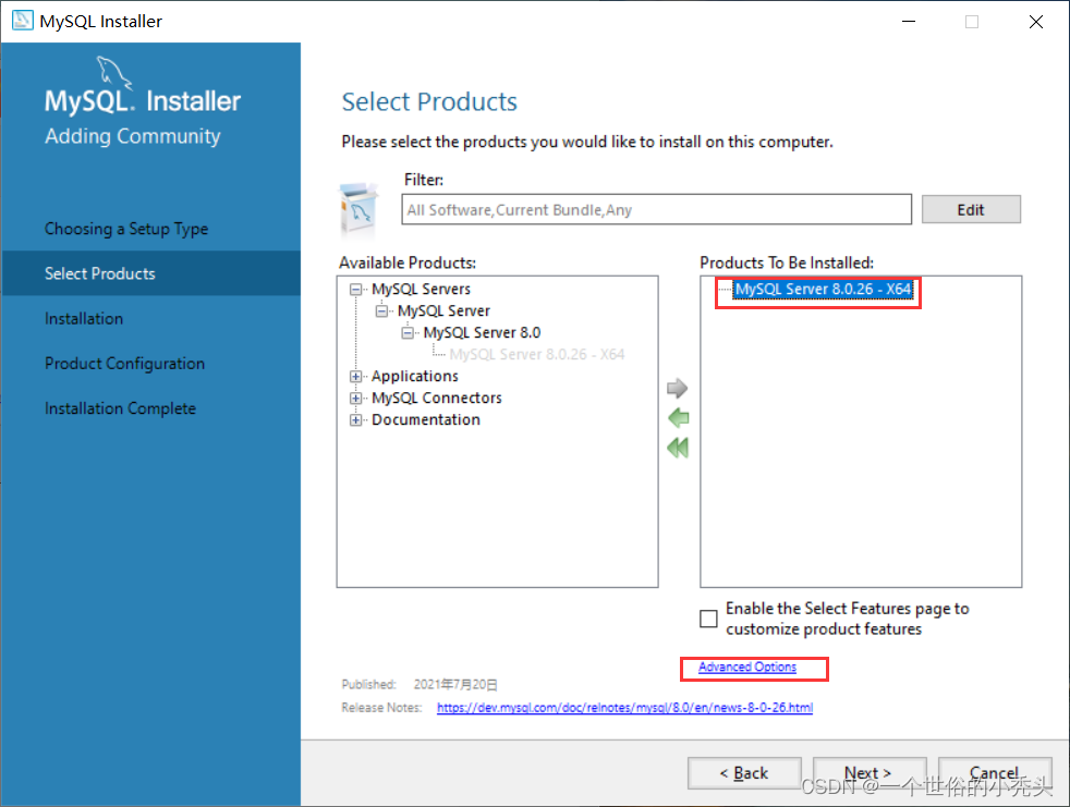 9)选中“Mysql Server 8.0.26-x64”,然后下面会出现“Advanced Options”,点击进入,选择好路径,点击“Next” (修改安装路径以及数据库存储路径)