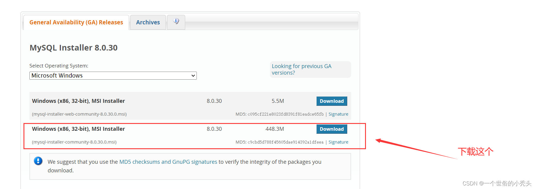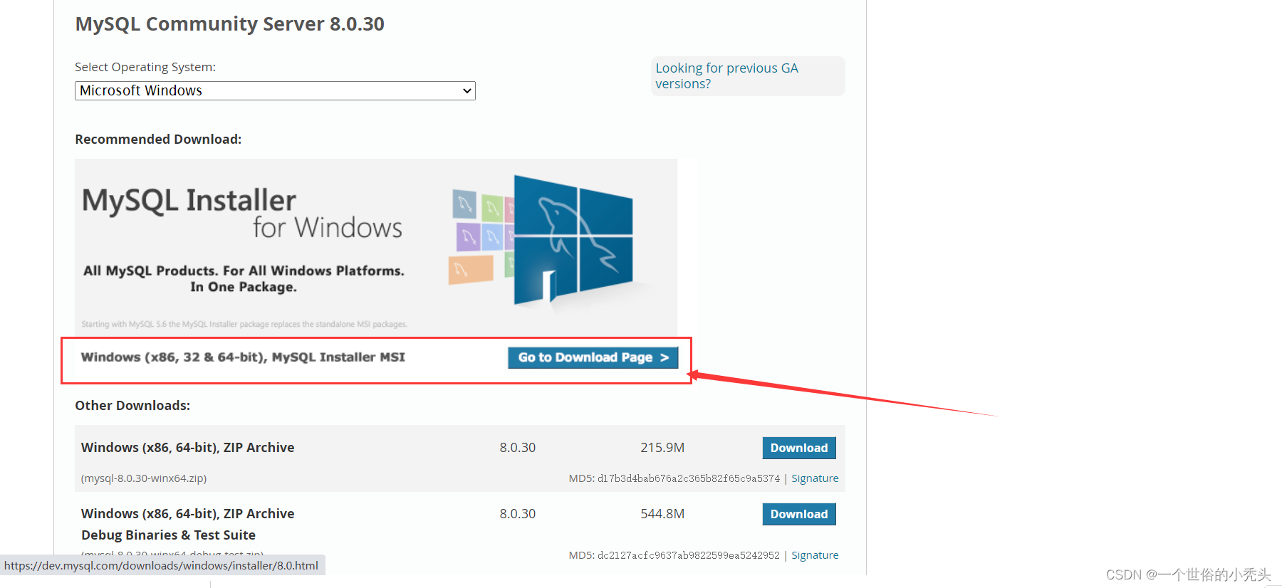 3)选择如图"Go to Downloads Page>":(zip包含的安装程序是一种主动安装,而msi包含的是被installer所用的安装文件以提交请求的方式安装,简单来说就是msi格式的配置安装更简单)