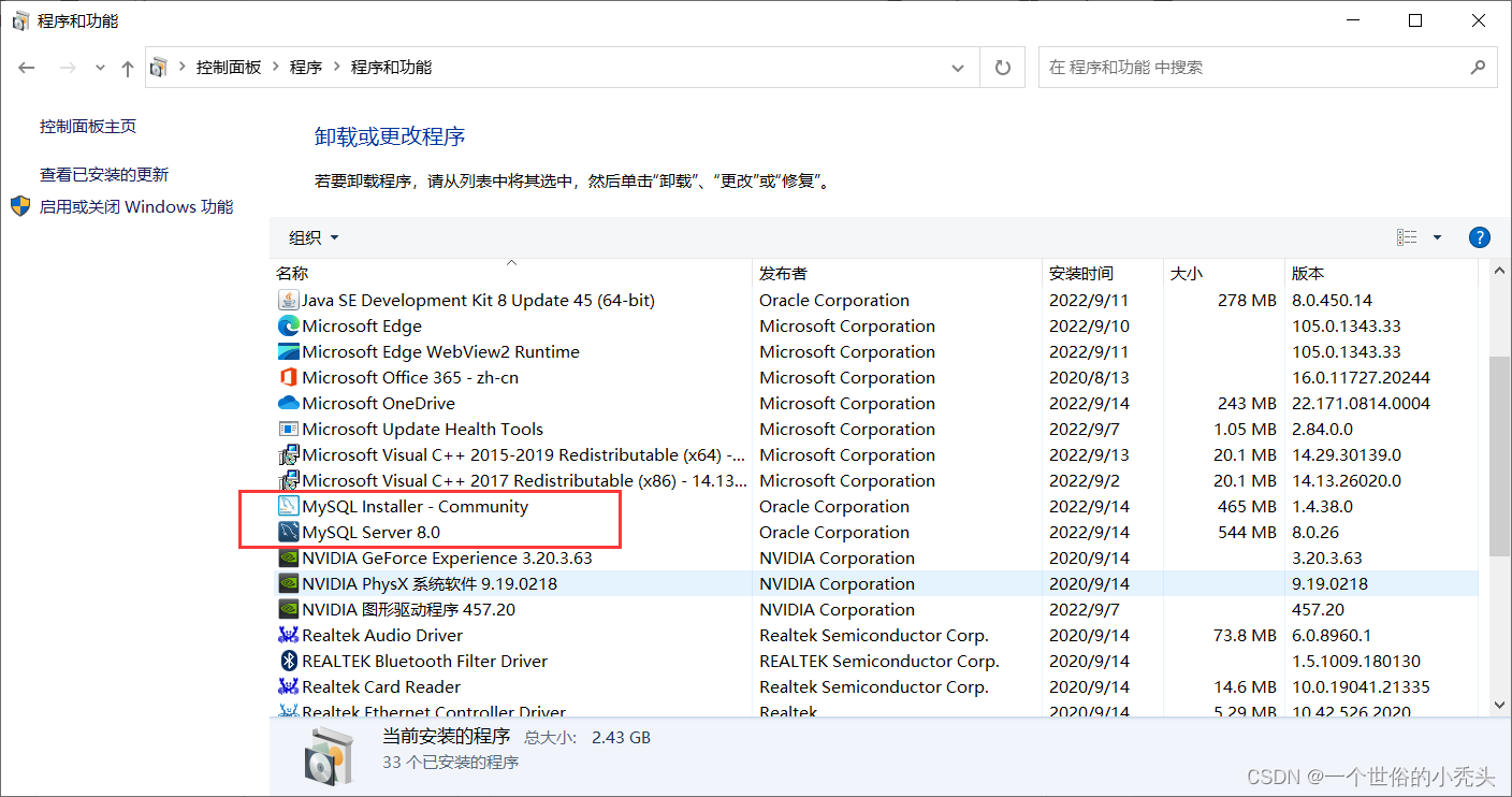 2、 在控制面版中,找到卸载程序,卸载Mysql相关软件