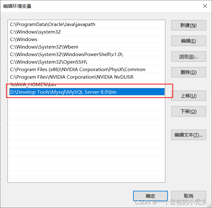 在”此电脑“--》”属性“--》”高级系统配置“--》”环境变量“--》”系统变量“--》”Path“路径下,添加你安装mysql的bin路径