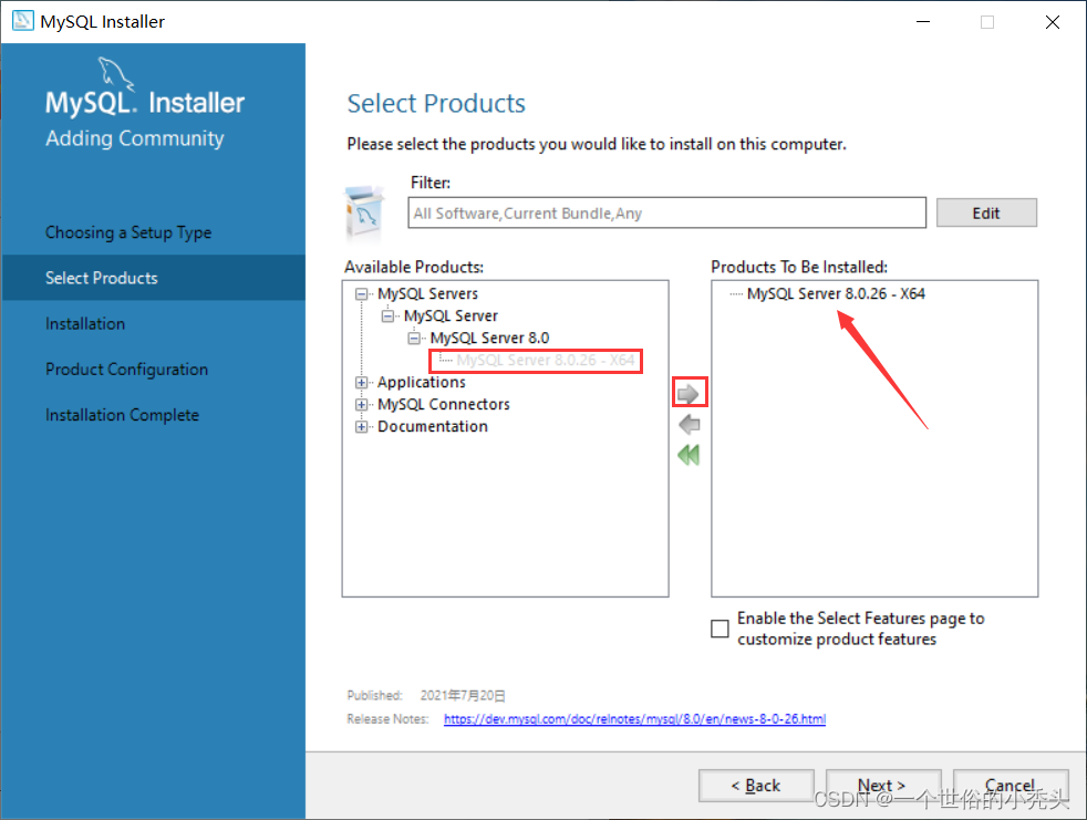 8)点开“Mysql Servers”,将“Mysql Server 8.0.26-x64”选中,点击右移箭头,移入右面如图