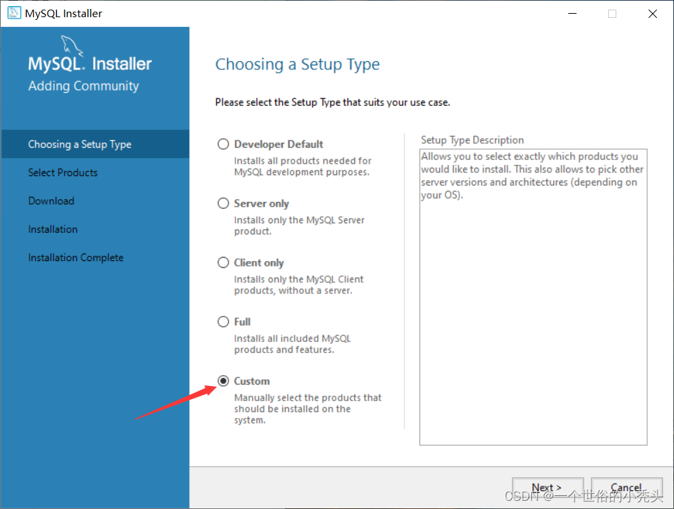 7)选择“Custom”,然后点击“Next”(手动选择应安装在系统上的产品,一般自己写个比如ssm项目就选择这个)