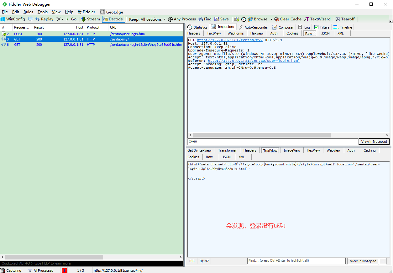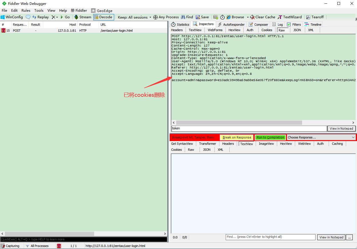 如下图一,断点已将cookies传的参数删除,接下来允许发送。图二,明显发现登录没有成功,没有到达禅道-我的地盘这个html的返回。