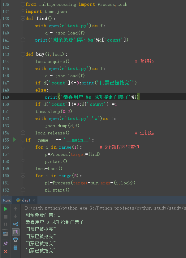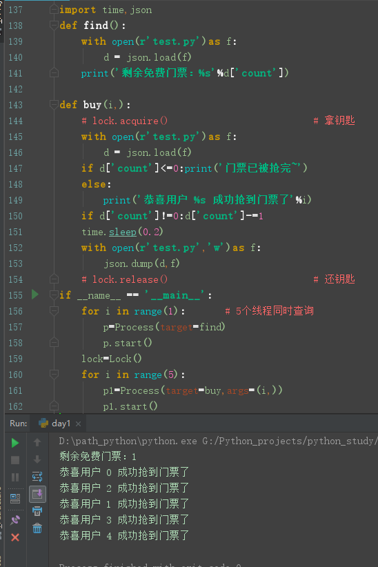 from multiprocessing import Process,Lock import time,json def find(): with open(r'test.py')as f: d = json.load(f) print('剩余免费门票:%s'%d['count']) def buy(i,lock): lock.acquire() # 拿钥匙 with open(r'test.py')as f: d = json.load(f) if d['count']<=0:print('门票已被抢完~') else: print('恭喜用户 %s 成功抢到门票了'%i) if d['count']!=0:d['count']-=1 time.sleep(0.2) with open(r'test.py','w')as f: json.dump(d,f) lock.release() # 还钥匙 if __name__ == '__main__': for i in range(1): # 5个进程同时查询 p=Process(target=find) p.start() lock=Lock() for i in range(5): p1=Process(target=buy,args=(i,lock)) p1.start()