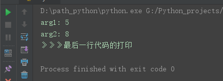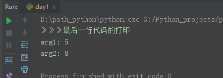 from multiprocessing import Process def func(arg1,arg2): print('arg1:',arg1) print('arg2:',arg2) if __name__ == '__main__': p=Process(target=func,args=(5,8)) p.start() print('》》》最后一行代码的打印') # 没约束时,不会待进程执行完再执行下面的代码