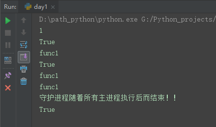from multiprocessing import Process import time def func(): while 1: time.sleep(1) print('func1') if __name__ == '__main__': p=Process(target=func) p.daemon=True # 设置为守护进程 p.start() print(1) print(p.is_alive()) # 查看进度是否存在,返回bool time.sleep(2) # p.terminate() # 结束一个进程 print(p.is_alive()) time.sleep(2) print('守护进程随着所有主进程执行后而结束!!') print(p.is_alive())