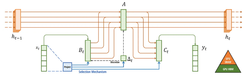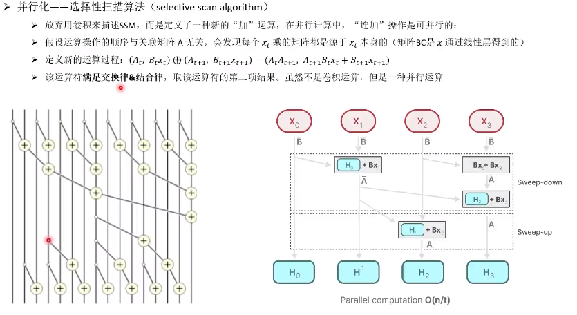 这种算法通过选择性扫描算法实现并行运算、内核融合和有效存储(中间)结果的重新计算,提高了计算效率。