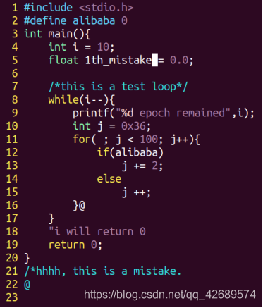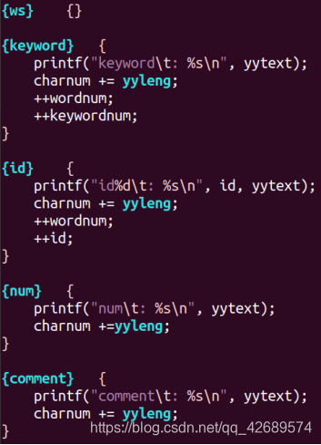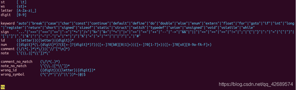 声明的第二部分定义词法分析程序要识别的标识符,常数,运算符,关键字,分隔符等单词符号,以及错误处理用到的模式,用正则表达式表示。需要注意:“include”,“define”不属于关键字。同时我也考虑了二进制数,八进制数,十六进制数的情况,将其归入num中。