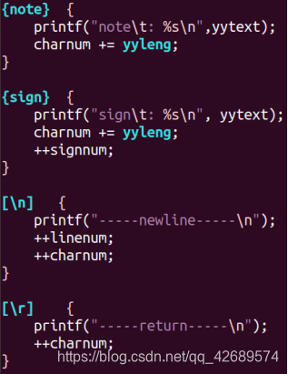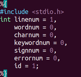 声明分两部分,第一部分由“%{”和“%}”包括起来,包含所引用的头文件,以及用到的全局变量。我用到的全局变量有:行号,单词数,字符数,关键字数,符号数,标识符号。