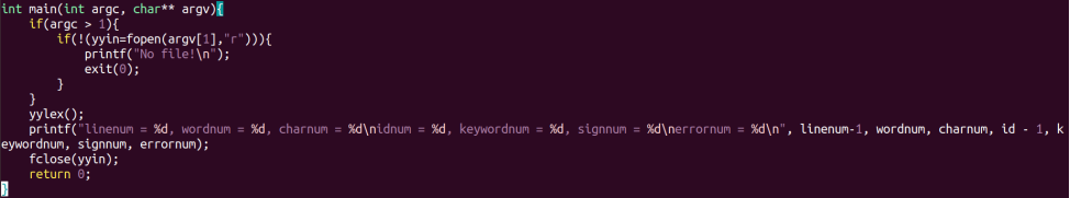 辅助过程,定义主函数,要用到Lex提供的函数和变量,参考IBM推出的教程,这里介绍一下。主函数检查参数,调用yylex()函数分析源程序,并打印统计信息。