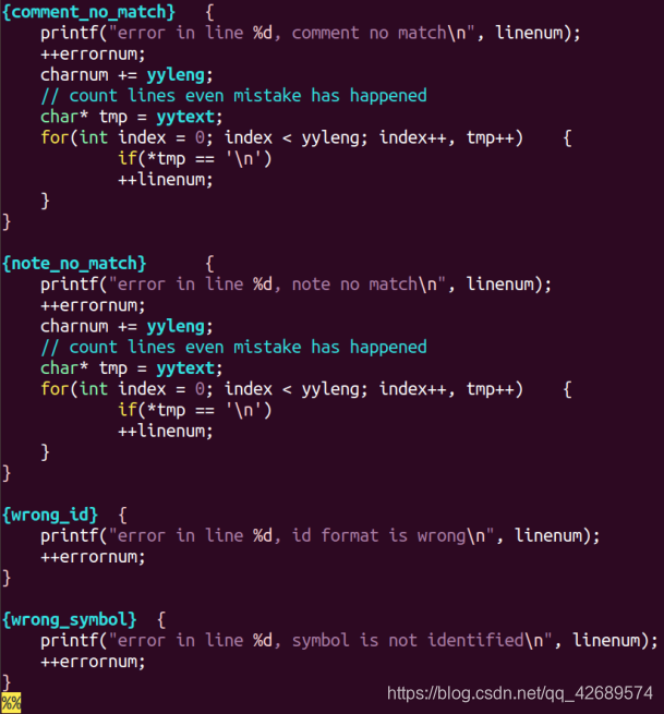 翻译规则部分,遇到一个单词,就在相应的统计变量加一,输出提示信息,同时考虑错误处理,我将错误分为四类:第一类是注释符不匹配,第二类是引号不匹配,第三类是标识符格式错误,第四类是在非注释、非引号部分出现“~@”等符号。第一类第二类错误发生了仍要计算行数。