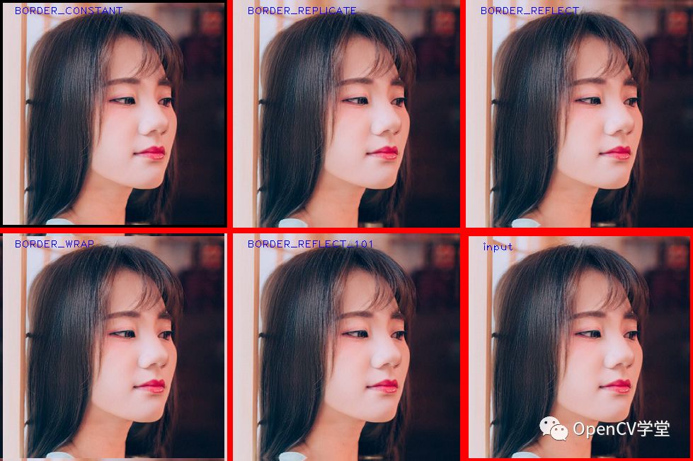 上图背景为红色,填充上下左右四个像素大小边缘!右下角为原图,左上角图像为常量边缘填充效果(i=0黑色)。