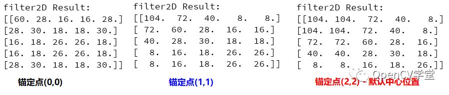 在进行卷积处理的时候,卷积mask与对应的像素块点乘得到输出,把输出结果赋值给哪个像素点是由锚定参数anchor决定,以自定义滤波函数filter2D为例说明