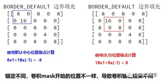 可以看到二者的输出结果全然不同,原因在于当锚定点不同的时候,卷积mask的开始位置也会不不同,图示如下: