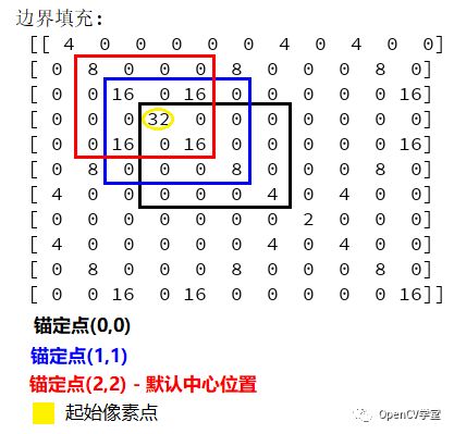 borderType - 表示边缘填充的像素大小,ksize/2其中ksize表示卷积核大小上述函数在卷积核为奇数的时候,卷积核的中心位置很容易确定,比如3x3的卷积核大小,中心位置为Point(1,1),5x5的卷积核大小中心位置为Point(2,2)