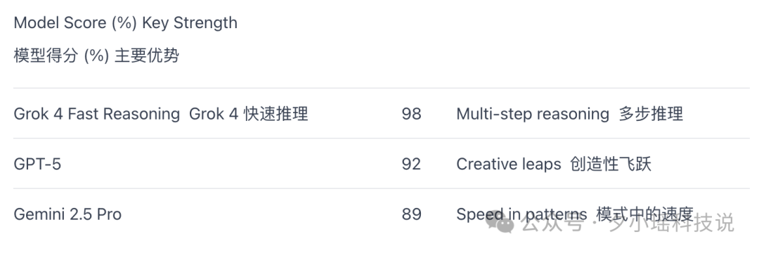 在极度考验语义理解与分类推理能力的纽约时报连线谜题(NYT Connections Benchmark)中,Grok 4 Fast Reasoning 以其卓越的“智商”直接登顶,超越了 GPT-5、Gemini 2.5 Pro 等一系列顶级模型。