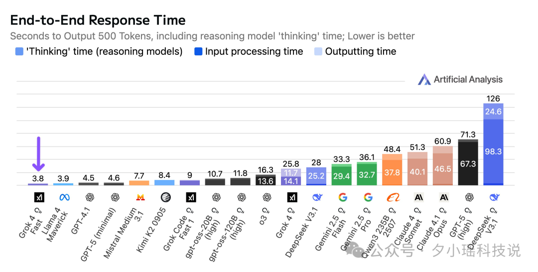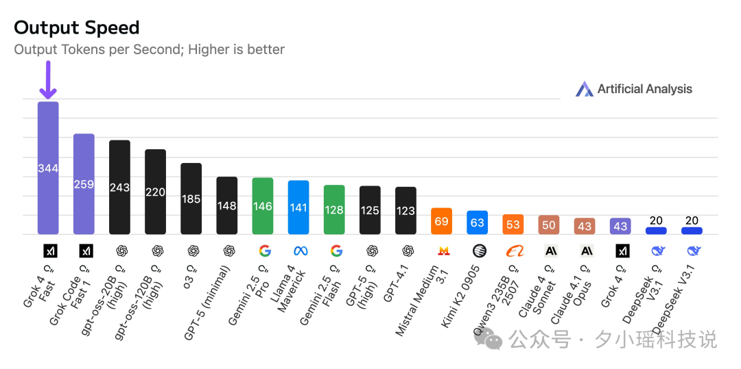 更夸张的是它的速度,根据 Artificial Analysis 的独立评测,Grok 4 Fast API 非常快,输出速度高达 344 tokens/秒,大约是 OpenAI GPT-5 API 的 2.5 倍,端到端延迟仅 3.8 秒,是当之无愧目前最快的前沿模型: