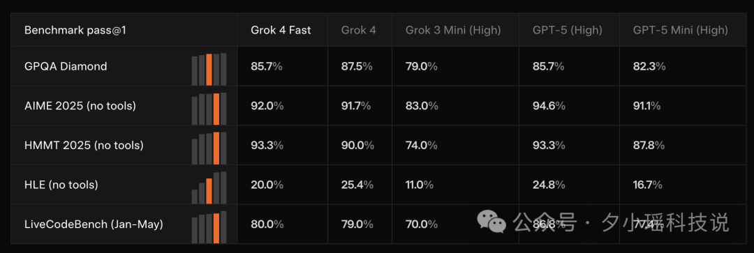 更关键的是,Grok 4 Fast 不仅实现了平均 40% 的 Token 节省和极具攻击性的定价,更在各大权威基准测试中取得了“屠榜”级的表现: