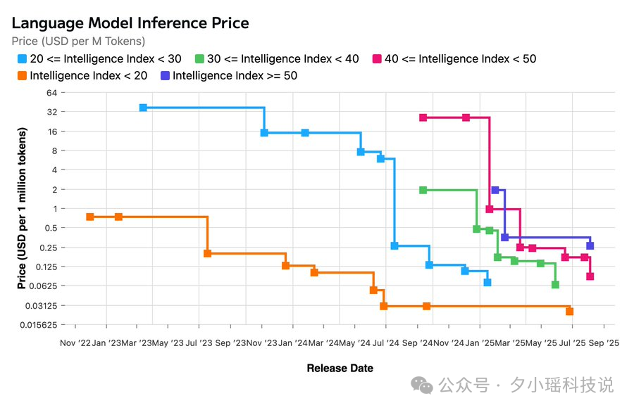 根据数据统计,在过去一年半里,获取 GPT-4 级别智能的成本已经下降了约 500 倍: