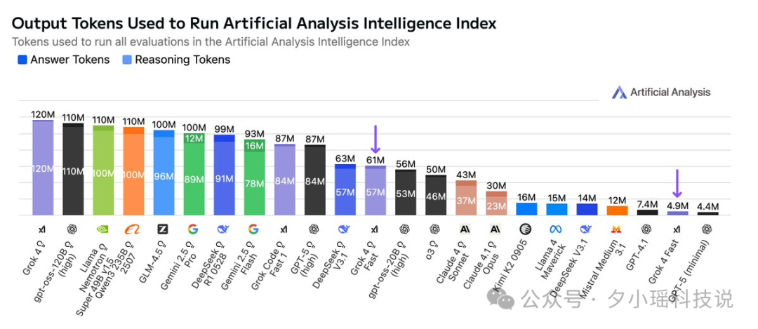 除了出色的性能,Token 效率是 Grok 4 Fast 的另一大亮点—它使用 6100 万 token 完成了智能指数测试(Gemini 2.5 Pro 用了 9300 万,Grok 4 用了 1.2 亿)。