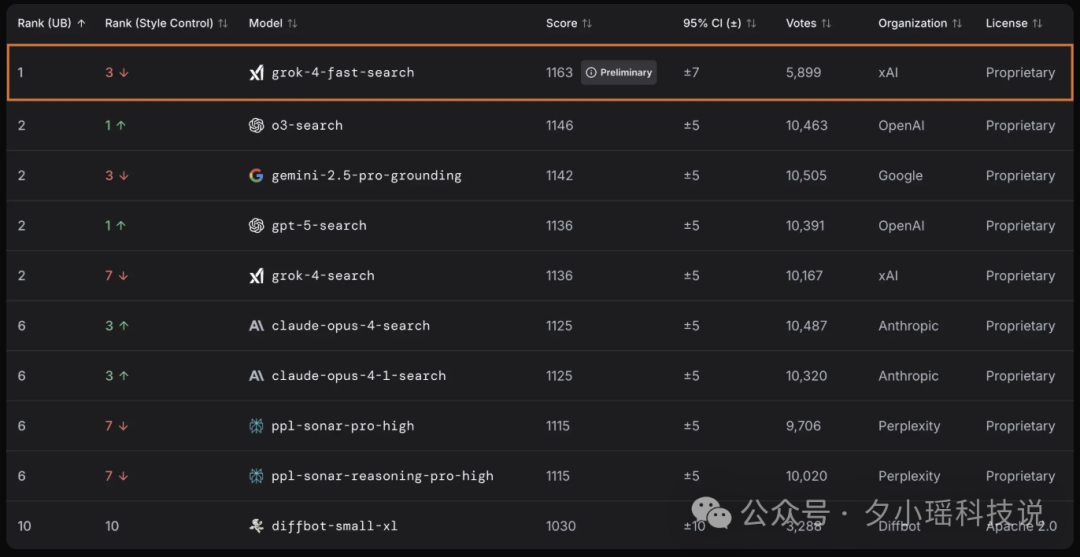 在 LMArena 搜索竞赛中,Grok-4-Fast-Search 以 1163 的 ELO 评分夺得冠军,领先第二名 o3-search 17 分,展现了其在模拟真实世界应用场景中的绝对优势: