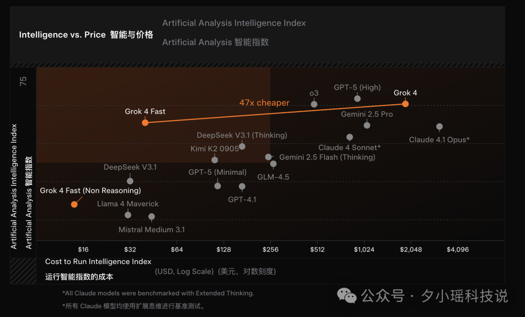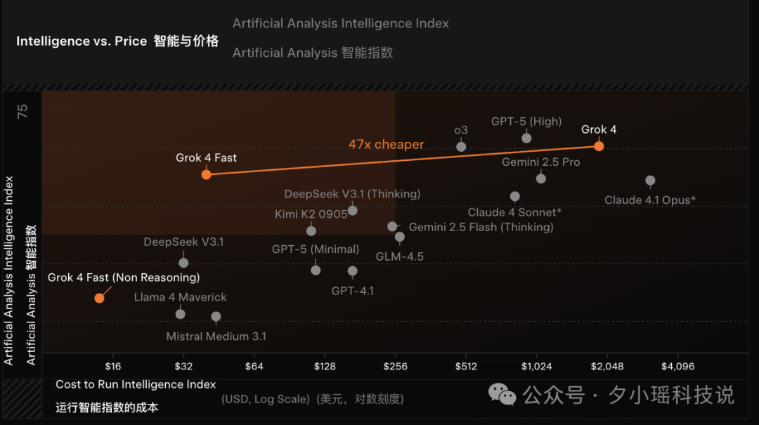 在著名的“Artificial Analysis 智能指数”中,Grok 4 Fast 仅用 Gemini 2.5 Pro 约二十五分之一的成本,就达到了同等级别的智能表现。