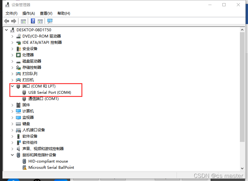 3.打开设备管理器,查看端口,我的是COM4,这个可能每次不固定。找不到可以将线拔掉再插上,看多了哪个端口。