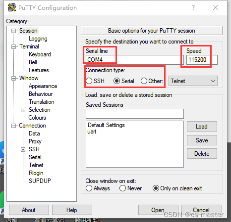4.打开putty,设置如下:这里设置的COM4就是刚刚第二步查看到的
