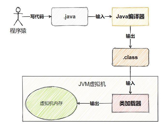 我们编写的Java类也就是.java文件,通过Java编译器编译成.class文件,.class文件中保存着Java代码转换后的虚拟机指令。