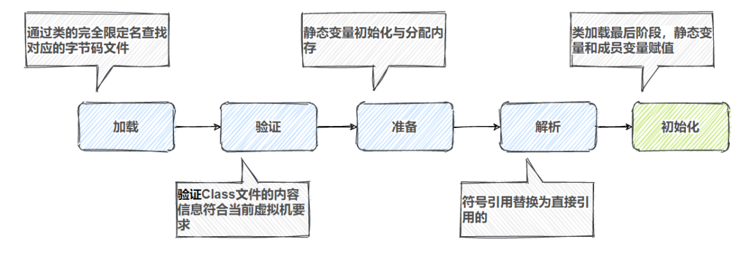 类加载过程分为加载、验证、准备、解析、初始化,下图是对类加载过程简单的介绍。