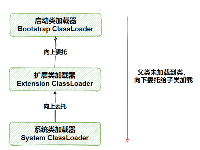 双亲委派模式的原理也十分简单,类加载器收到类加载请求,会委托给父类加载器去执行,父类加载器还存在其父类加载器,则进一步向上委托,依次递归,直到顶层类加载器,如果顶层类加载器加载到该类,就成功返回class对象,否则委托给下级类加载器去执行,依次递归(此处的父子关系并非通常所说的继承关系,而是采用组合关系来实现)。
