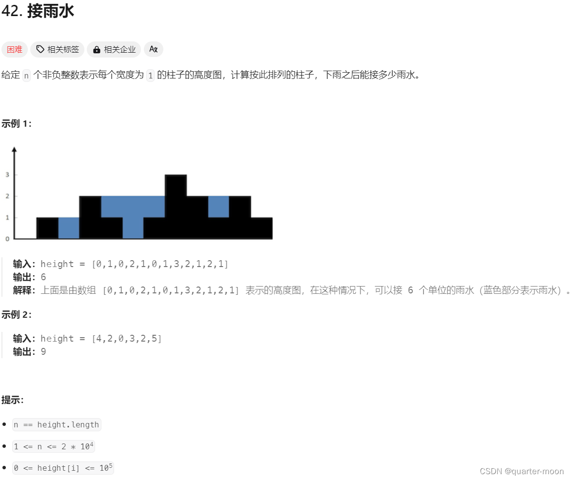 按照列计算,这样只要计算高度。有多种解法,首先是双指针解法,对于每个位置,遍历最右边和最左边最高高度,找到两者最小值-本列高度,就能得到当前装的雨水高度。更进一步是,每列的左侧最高高度转为左边一列的左侧最高高度和左侧一列的高度最大值,右侧类似,减少重复计算。