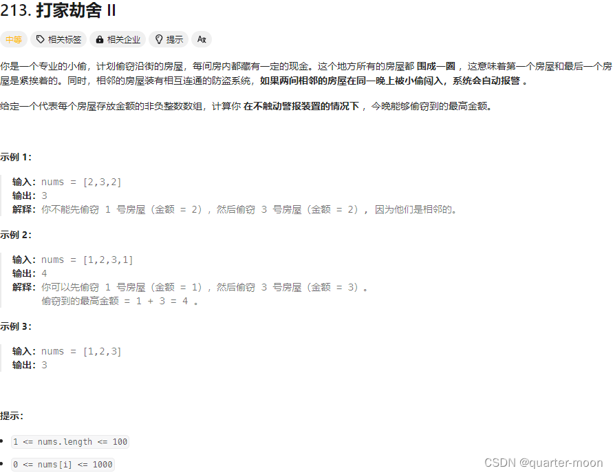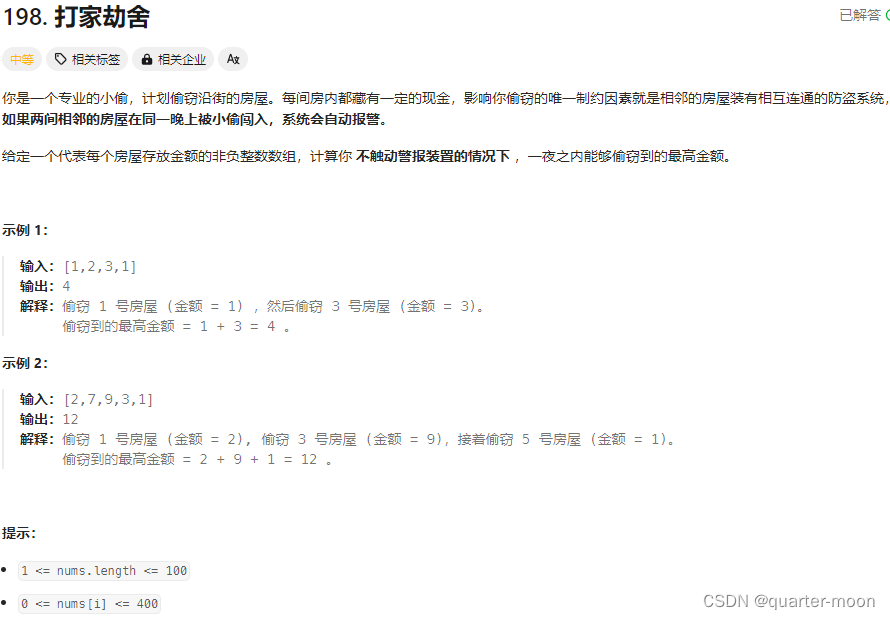 如果偷第i房间,那么dp[i] = dp[i - 2] + nums[i] ,即:第i-1房一定是不考虑的,找出 下标i-2(包括i-2)以内的房屋,最多可以偷窃的金额为dp[i-2] 加上第i房间偷到的钱。