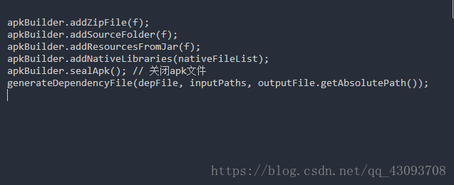 打包生成APK文件。旧的apkbuilder脚本已经废弃,现在都已经通过sdklib.jar的ApkBuilder类进行打包了。输入为我们之前生成的包含resources.arcs的.ap_文件,上一步生成的dex文件,以及其他资源如jni、.so文件。 大致步骤为 以包含resources.arcs的.ap_文件为基础,new一个ApkBuilder,设置debugMode