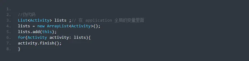 2、记录打开的 Activity: 每打开一个 Activity,就记录下来。在需要退出时,关闭每一个 Activity 即可。