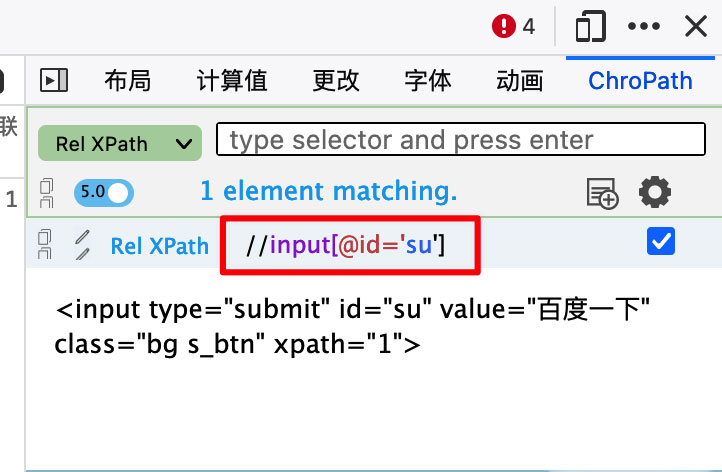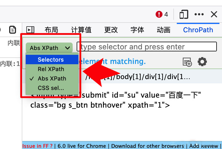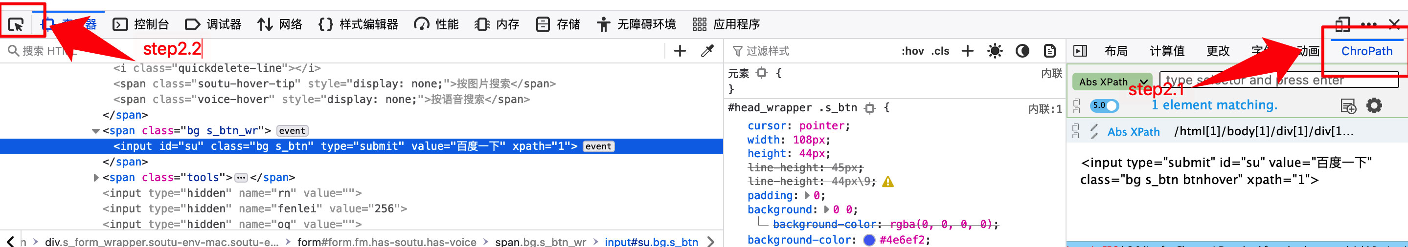 step2: 打开开发者工具,点击ChroPath,之后点击箭头小图标,鼠标移动到页面上选择需要执行操作的元素