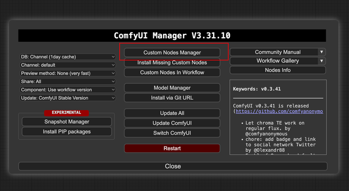 ComfyUI-Manager是ComfyUI的插件管理器,在这里可以找到所有上架ComfyUI的插件并安装。