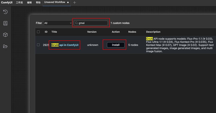 - 在 ComfyUI Manager 的 custom nodes 里搜索 Grsai 进行安装