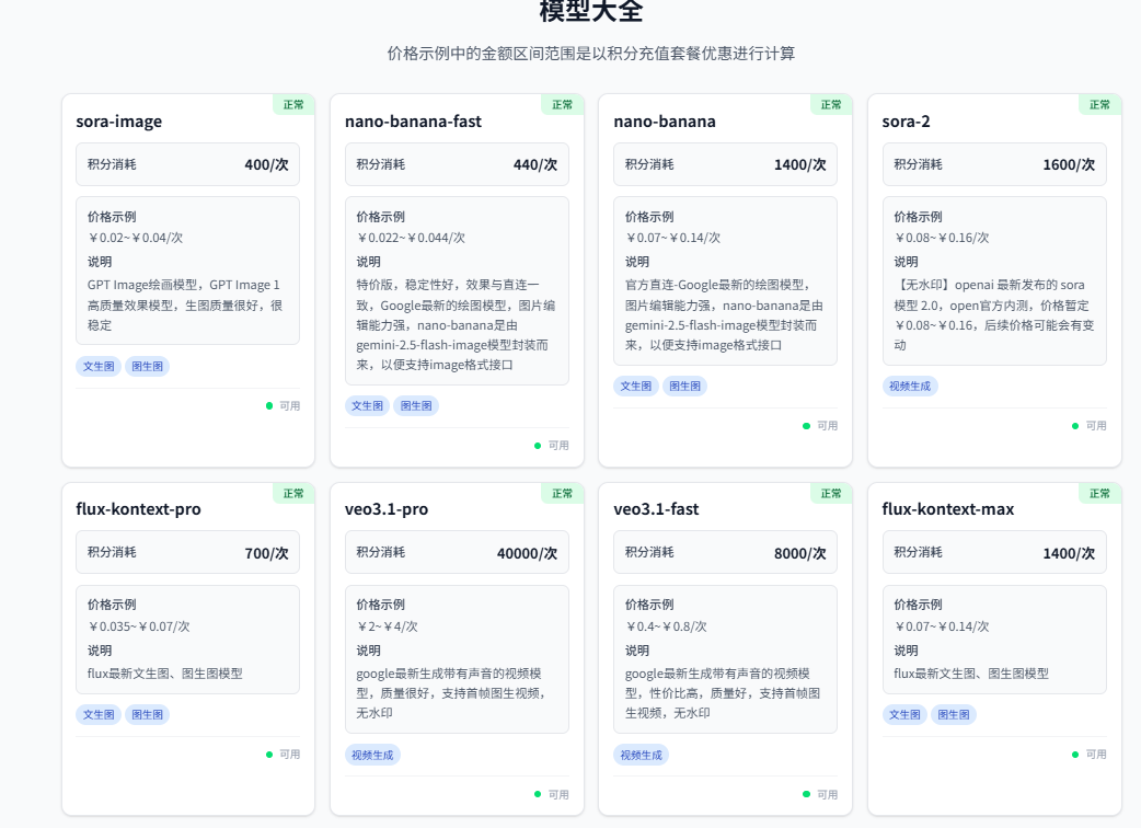 基本都是国外且数量不多,包含了:sora2,gpt4o,gemini,flux,gemini,Veo3.1多个版本的Ai大模型。涵盖了聊天,图片,视频三个创作领域。
