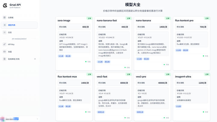 多模型成本极致优化:对于需要大量生成图片的独立创作者和团队来说,选择GrsAi能有效降本增效,模型包含Nano banana-0.022/张,sora2-0.08/条,sora-image-0.02/张,Veo3.1-0.4/条,Flux,gemini...包含图片,文本,视频模型。