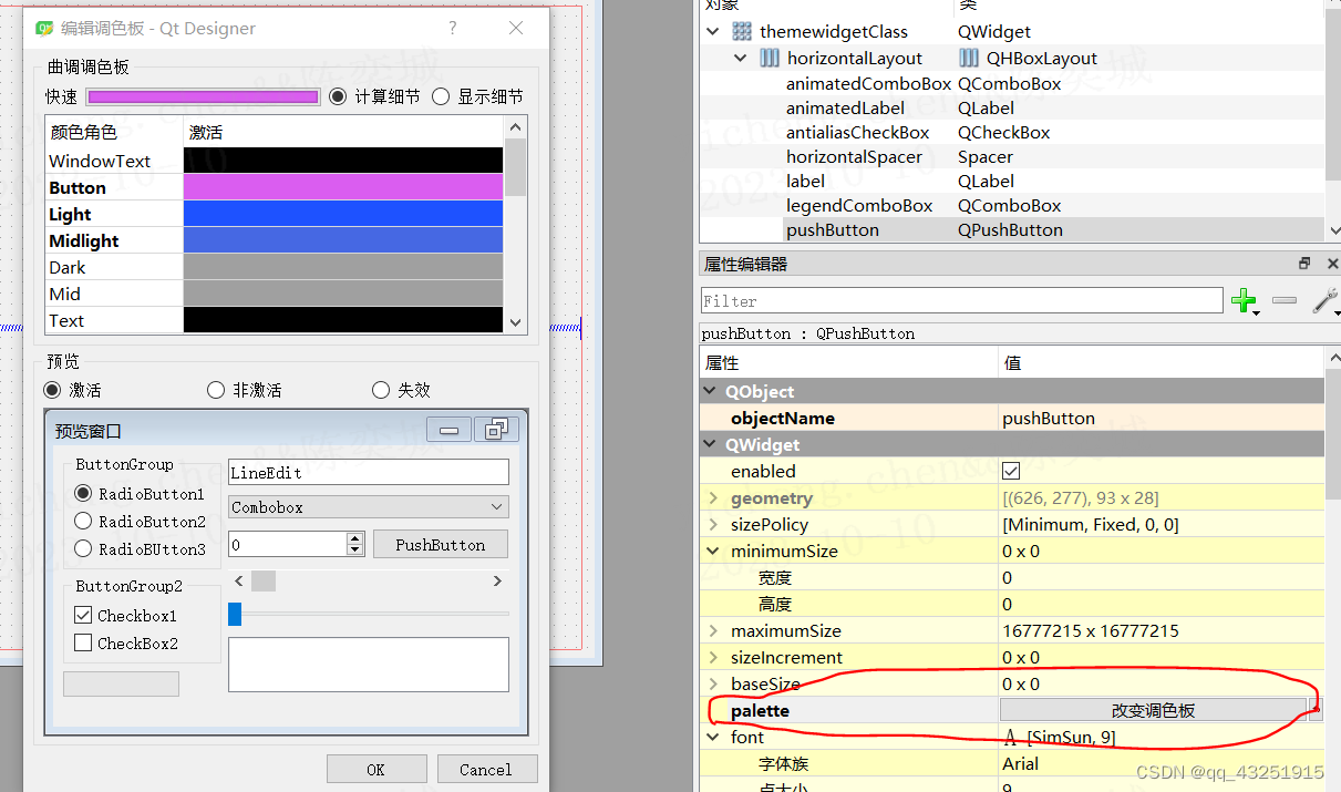 QPalette类有两个基本概念:一个是ColorGroup,另一个是ColorRole。详细可参见QT帮助手册。