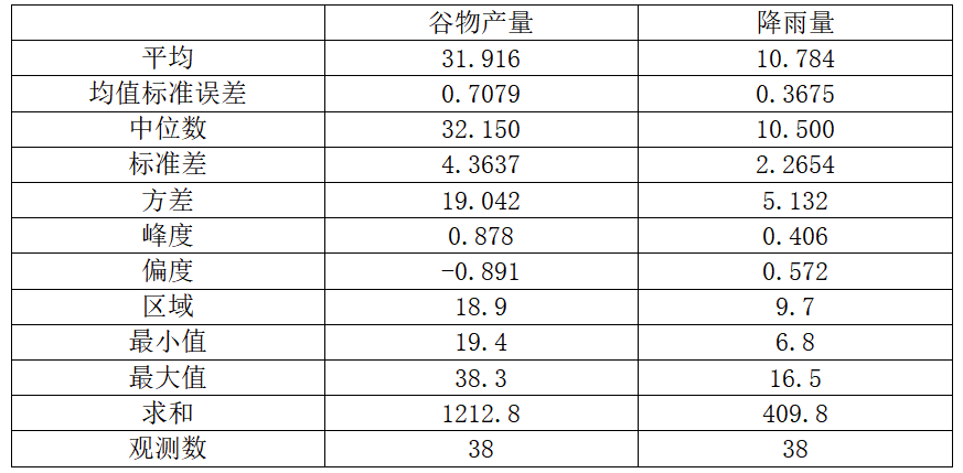 由上表可知,我国某地38年来的谷物产量最小值为19.4,最大值为38.3,均值为31.916,说明谷物产量整体有所增长,方差为19.042,说明谷物产量波动较大,不稳定。降雨量最小值为6.8,最大值为16.5,均值为10.784,方差为5.132说明降雨量相对波动较小,均均衡。