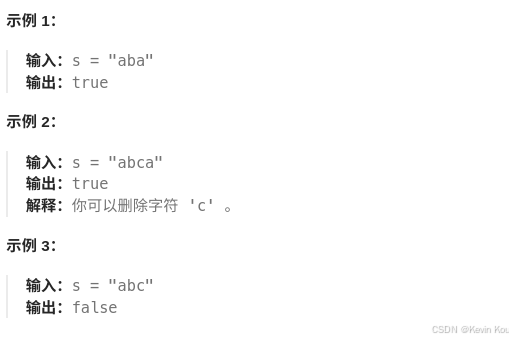 在允许最多删除一个字符的情况下,同样可以使用双指针,通过贪心实现。初始化两个指针low和high分别指向字符串的第一个字符和最后一个字符。每次判断两个指针指向的字符是否相同,如果相同,则更新指针,将low加1,high减1,然后判断更新后的指针范围内的子串是否是回文字符串。如果两个指针指向的字符不同,则两个字符中必须有一个被删除,此时我们就分成两种情况:
