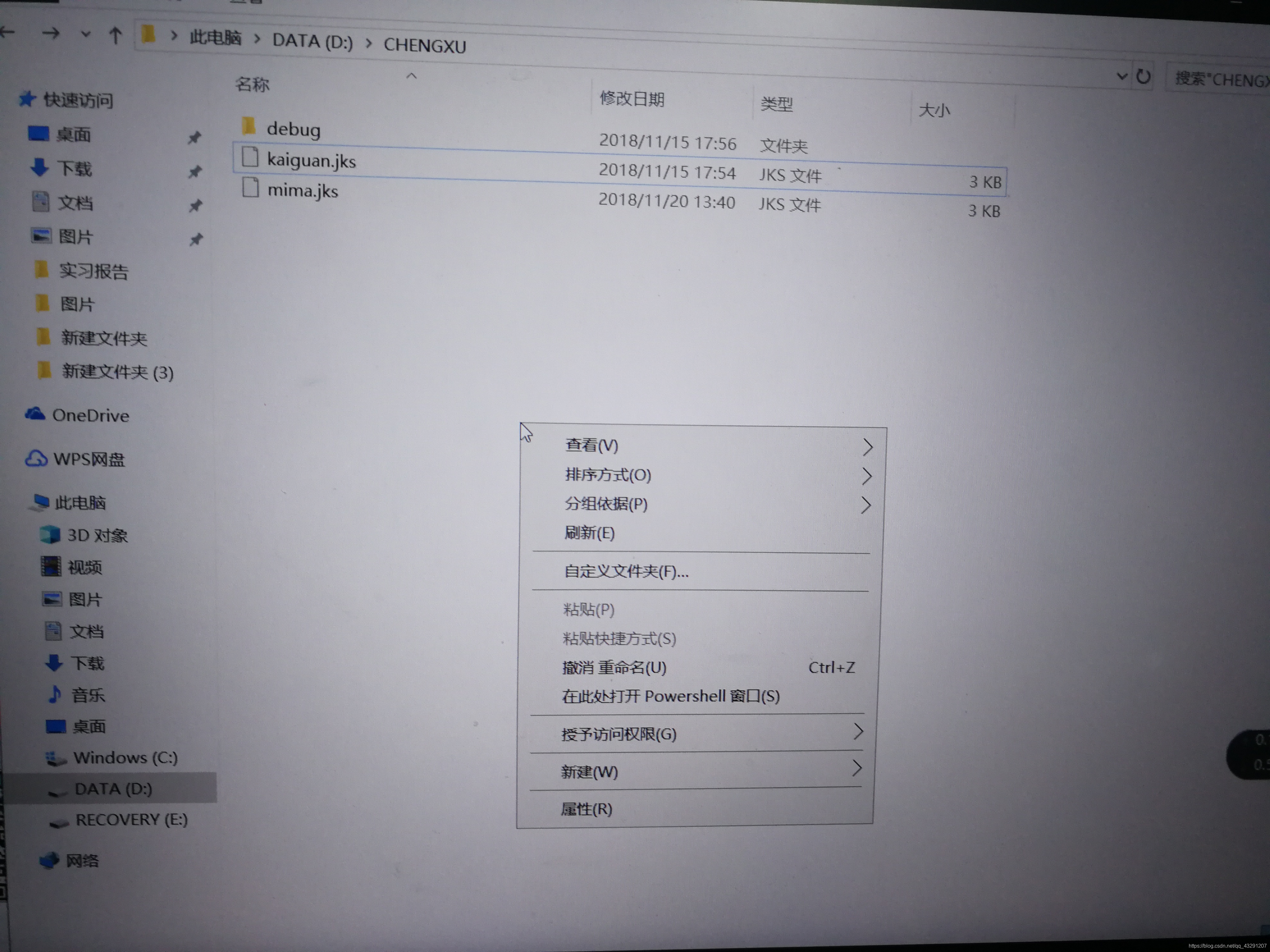 在安装了Android开发环境后,主目录下会自动创建一个隐藏的.android目录,其下有一个debug.keystore文件即为调试秘钥。我们先找到自己的.jks的放置文件下。按住SHIFT点击鼠标右键,如下图。