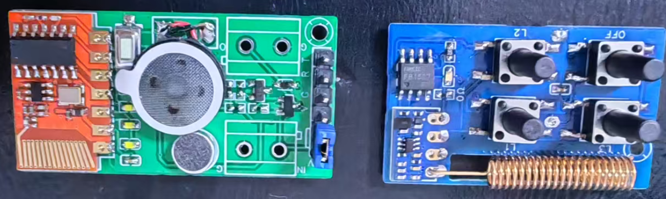 遥控接收端,自带天线。四路开关量输出或1路串口输出。使用灵活,具有免开发、免调试、低成本、自带解码、自动适应各种编码、自动学习射频遥控器等特点。可对应多种发射模块。