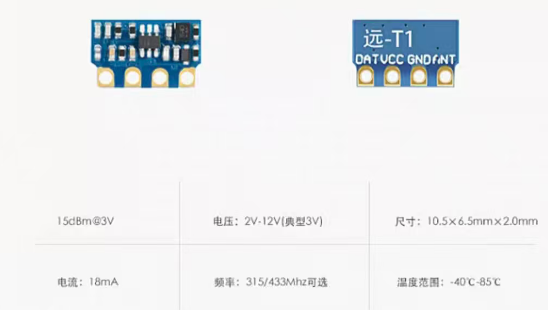 远_T1是一款微型ASK遥控发射模块,采用高性能RF集成芯片,内置谐波抑制电路,适合纽扣电池供电,可过FCC/CE认证。可方便用于1527/2240/2262等编码的各类射频遥控器。