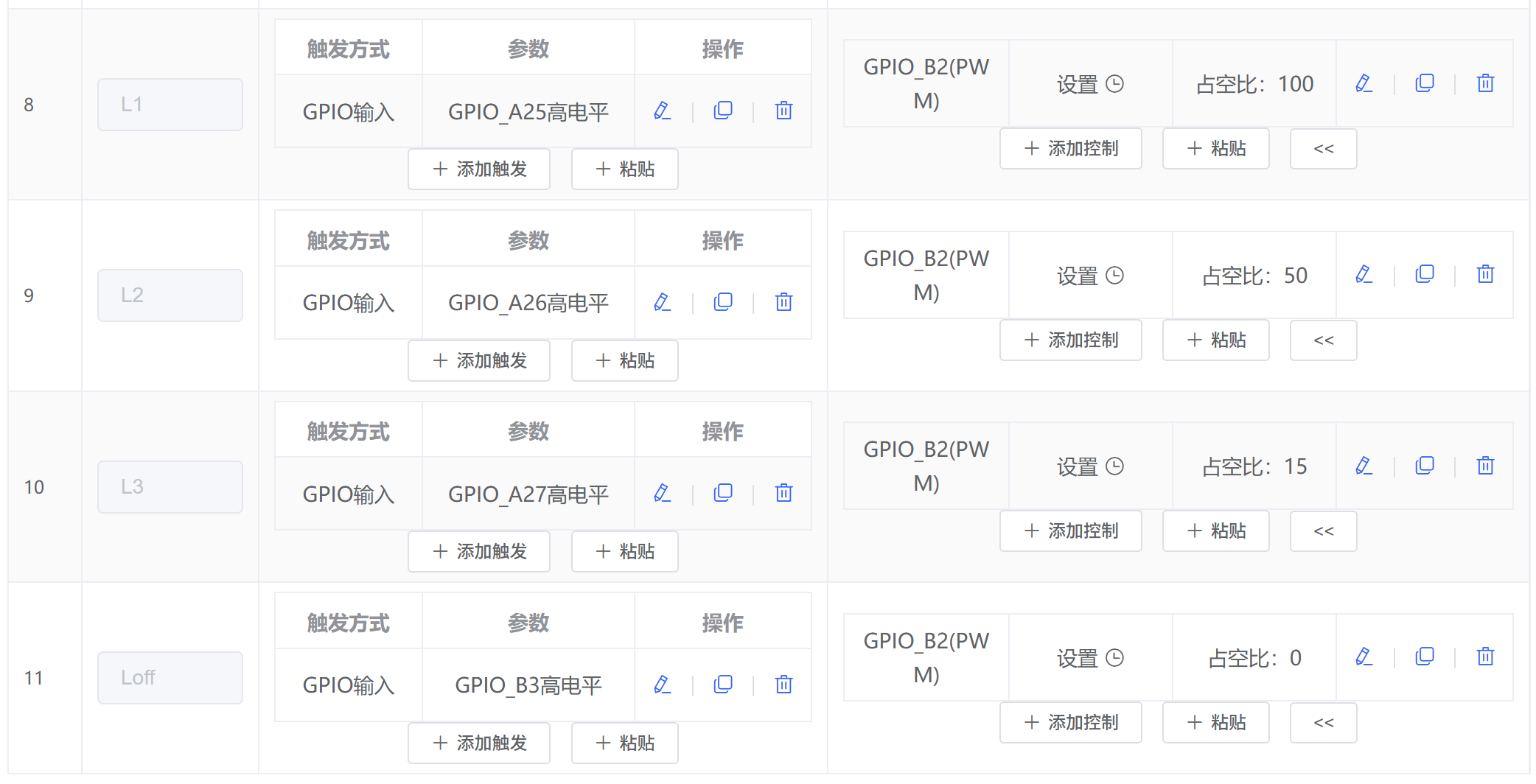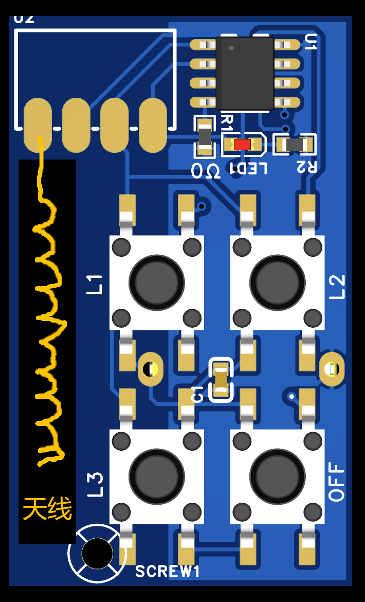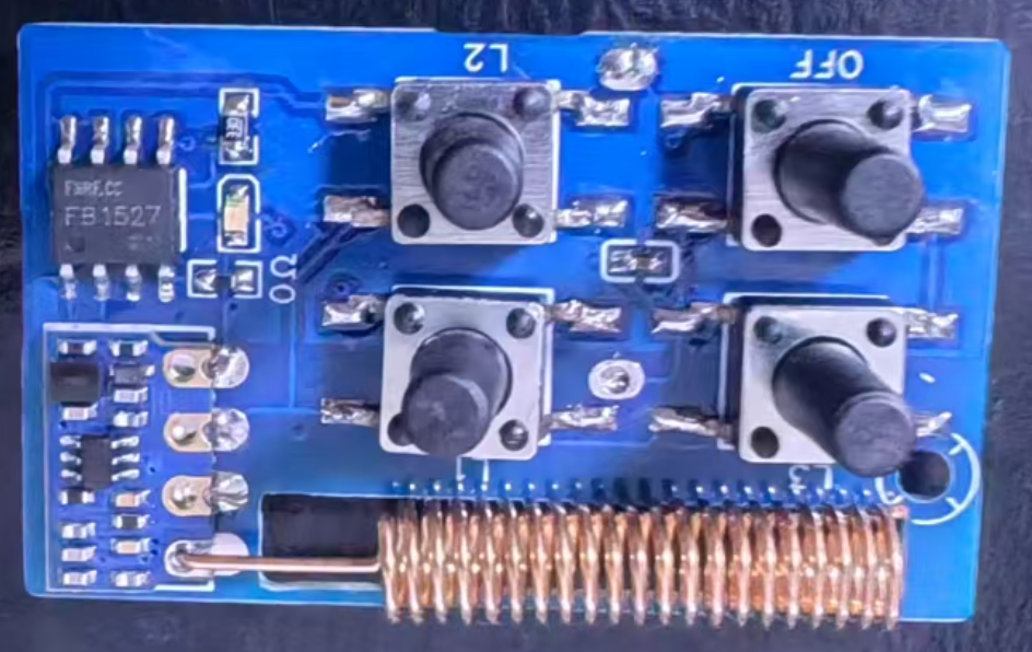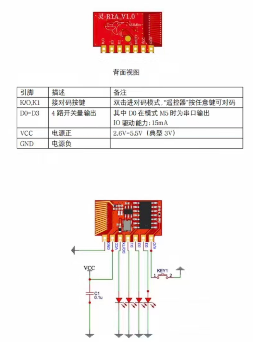 上电后快速双击 KEY1 按键可进入学习对码模式(蓝色指示灯规律闪烁),按下遥控器发射端任意按键完成对码;上电后长按 KEY1 按键8秒以上松开按键后,清空已学习的对码;工作期间短按 KEY1 按键,可实现急停,此时所有IO为低电平;