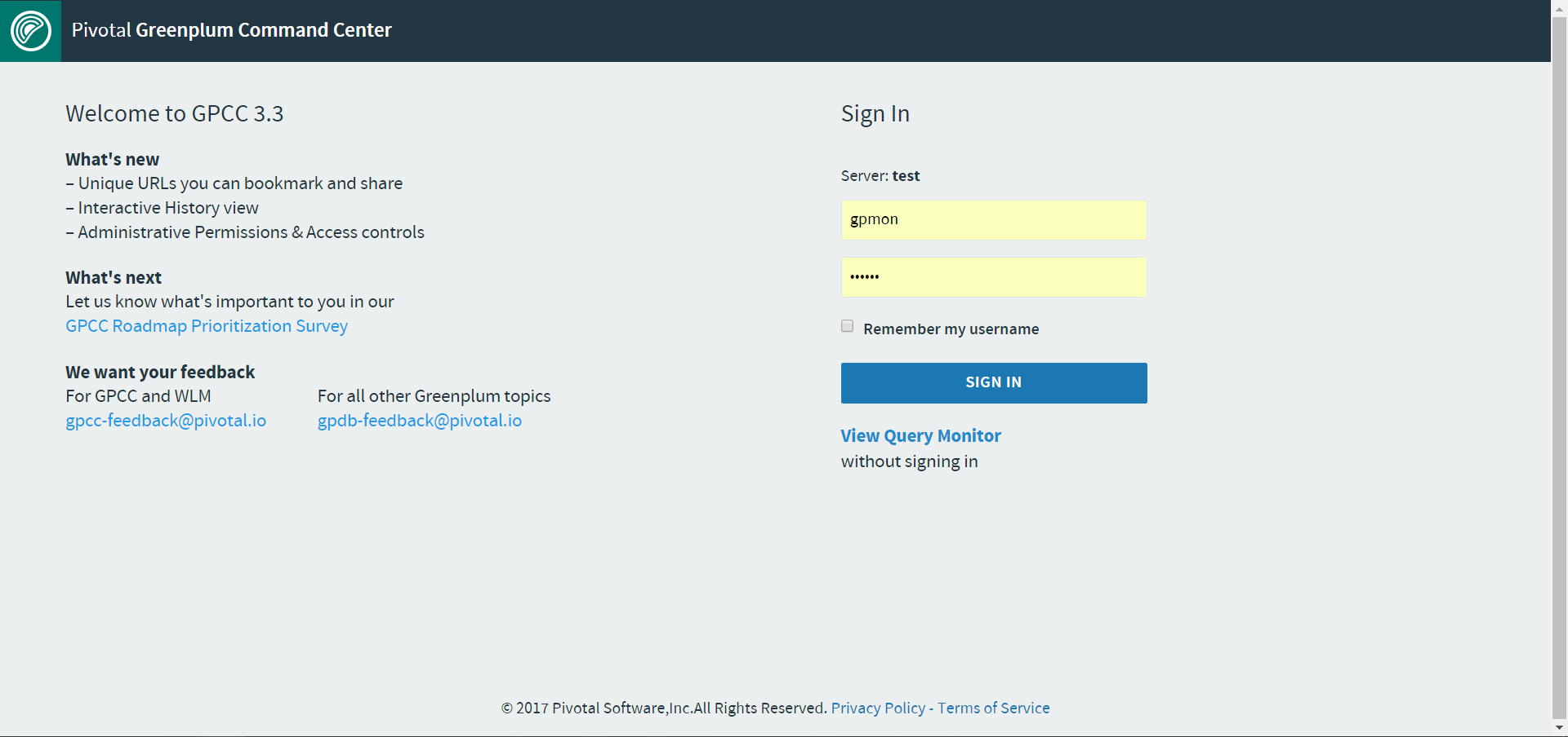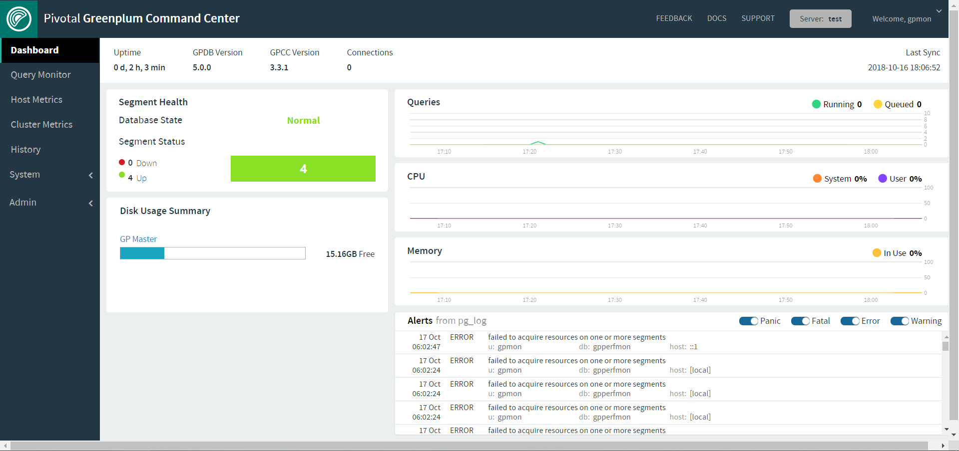 Greenplum Command Center UI for instance 'test' - [RUNNING on PORT: 28080, pid 20836]